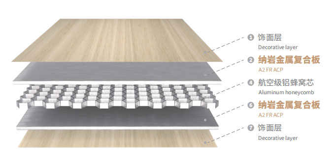 A级防火复合板与铝蜂窝的结合,内含荣获国内多项发明专利的无机防火芯层。