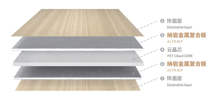 A级芯材与PET材料相结合,上下两层为荣获国内多项发明专利的无机防火芯层,中间采用PET材料。